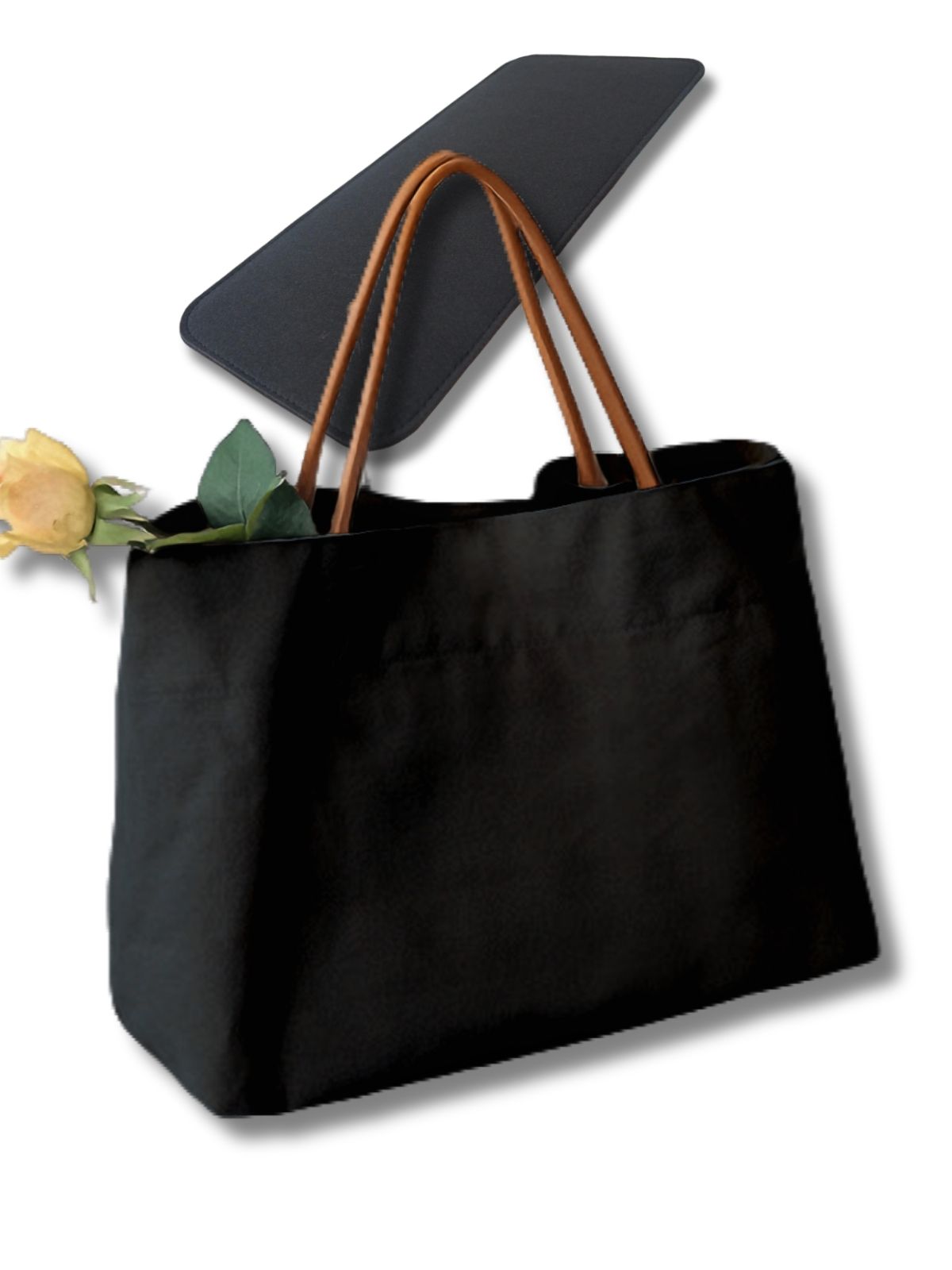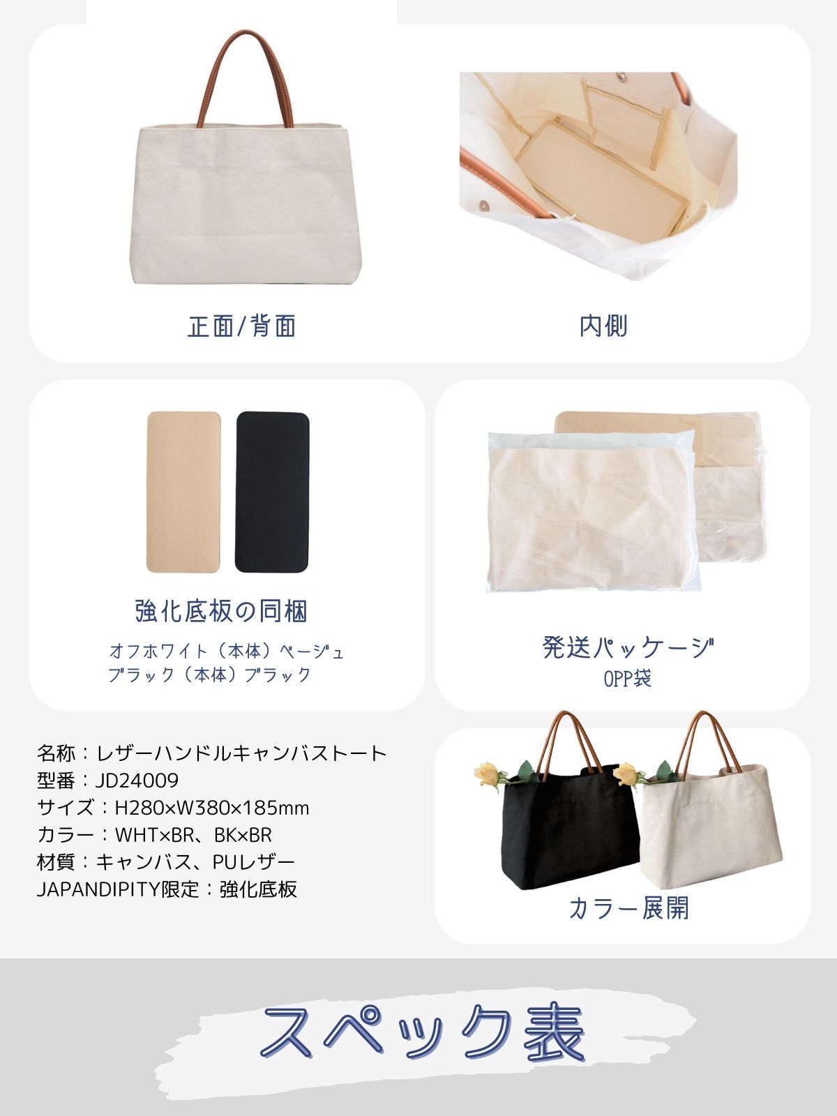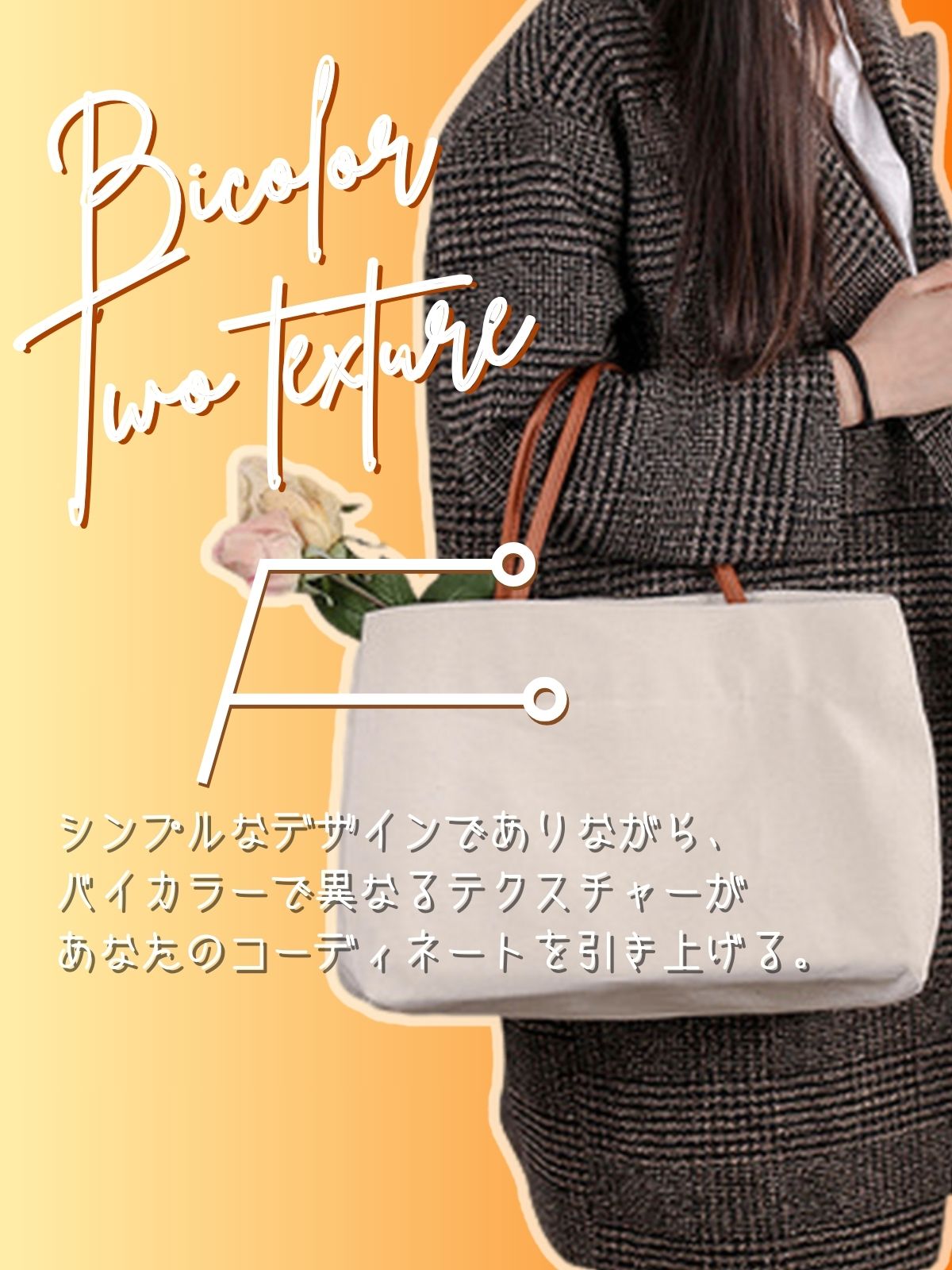 トートバッグのデザインは、キャンバス生地と革ハンドル(PUレザー)を組み合わせたバイカラー仕様です。異なるテクスチャーを持つ2つの素材を採用することで、シンプルながらもおしゃれな印象を演出しています。特に、キャンバスのカジュアルさとPUレザーの洗練された質感が融合し、どんなシーンにもマッチするデザインに仕上げられています。
