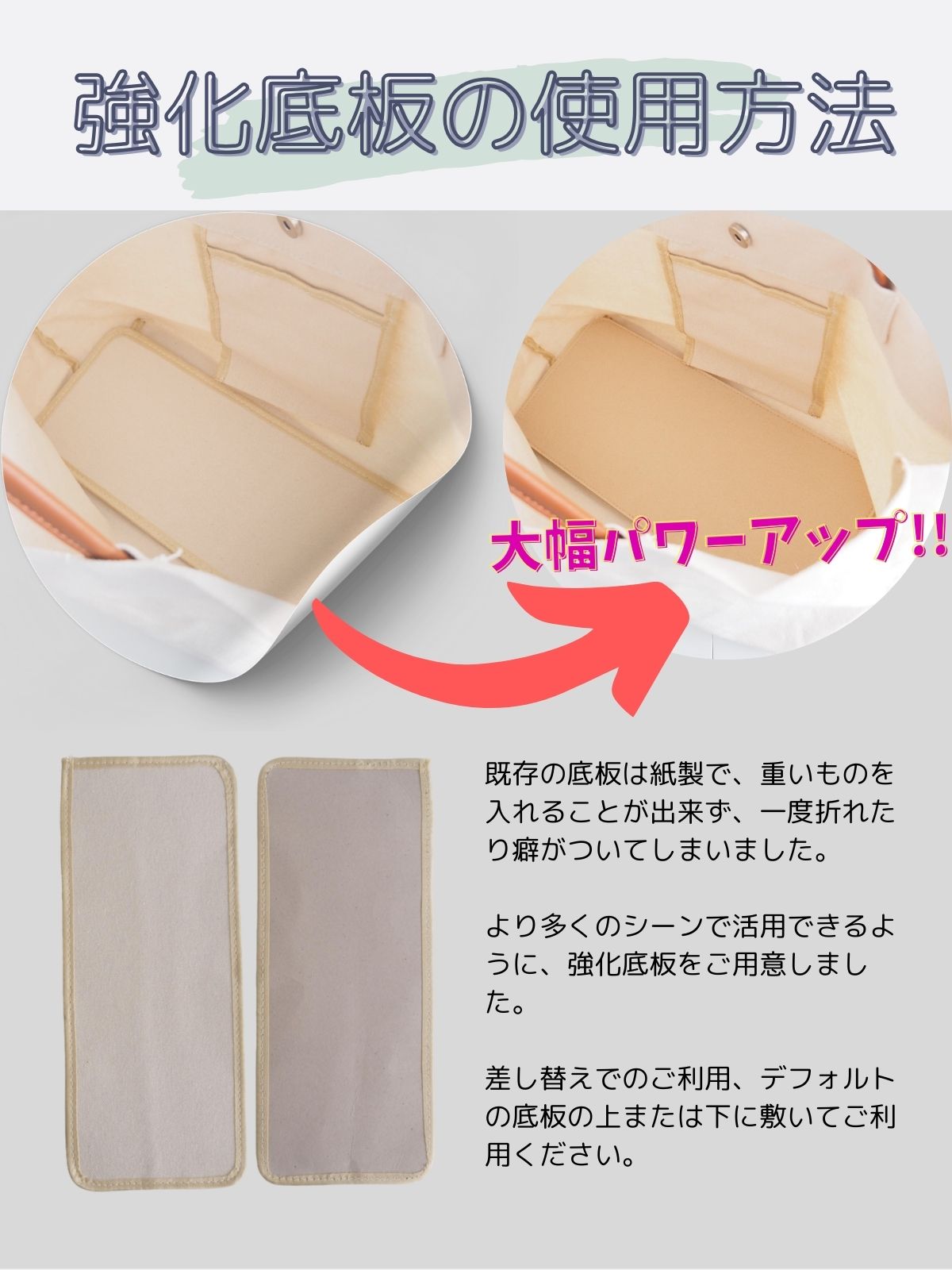 市販のトートバッグで底板を探すのは手間がかかり、サイズが合わない場合も多いですが、本製品にはあらかじめジャストサイズの底板が付属しています。これにより、別途底板を探したり、自作する手間が省け、購入後すぐに快適に使用することができます。