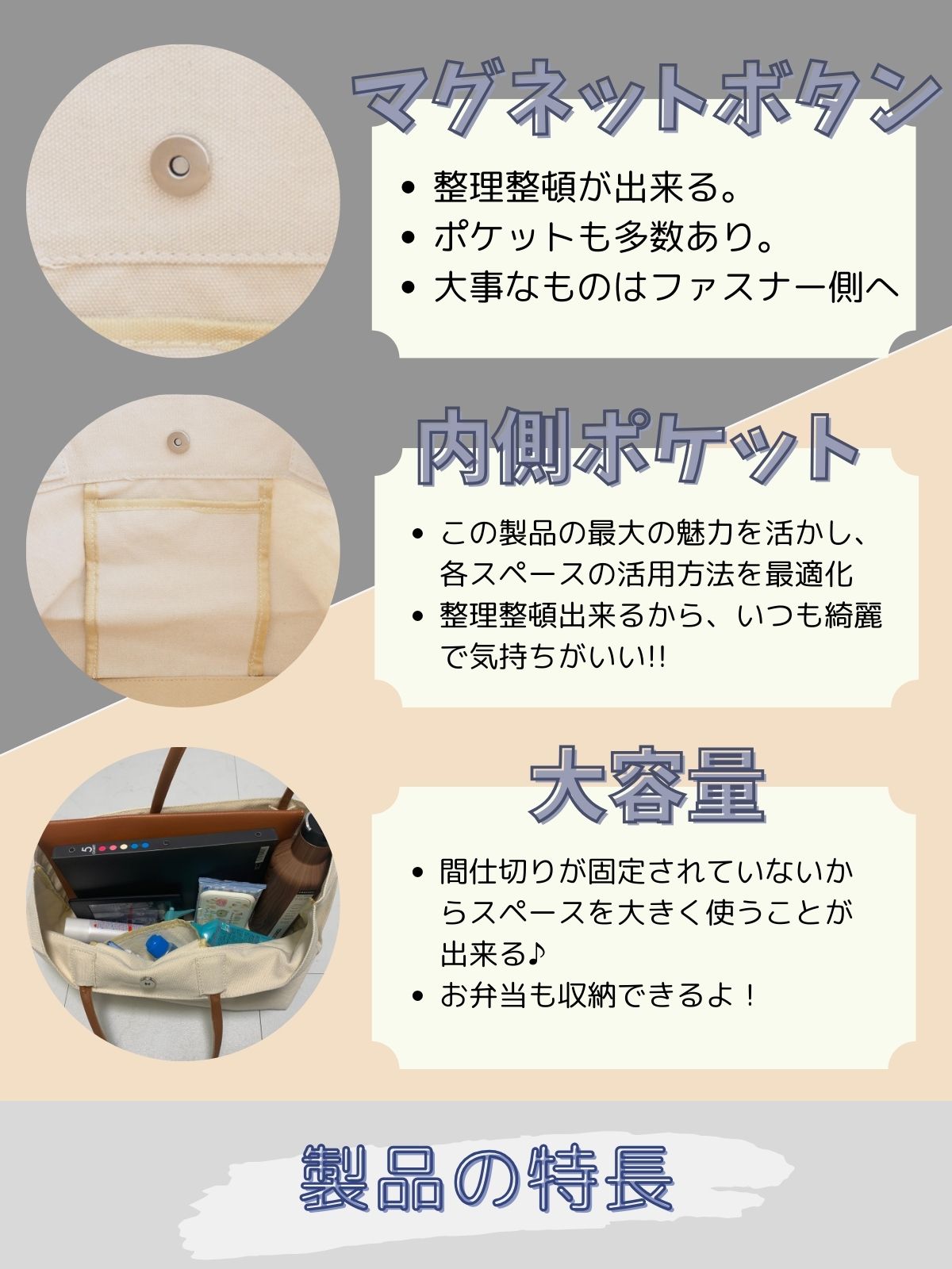 本製品は高品質のキャンバス生地を使用したトートバッグです。キャンバス素材は耐久性に優れており、日常的な使用にも適した丈夫さを持っています。見た目にもナチュラルな風合いが特徴で、使うほどに味わいが深まります。