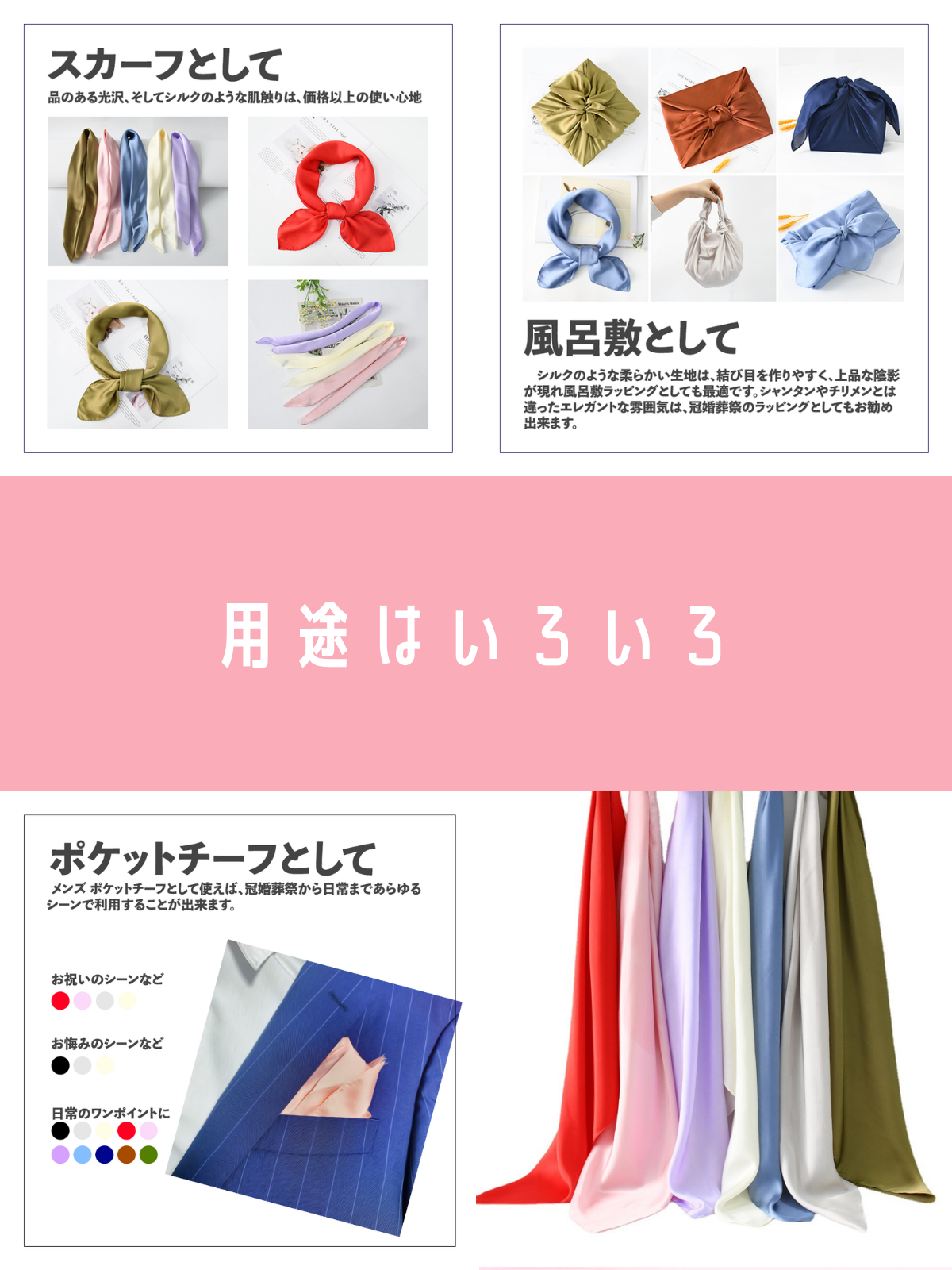 - 用途:レディース も メンズ 問わない ユニセックスの 大判クロスです。 スカーフ 、 ネッカチーフ 、 ハンカチーフ 、 バンダナ 、 風呂敷 、ラッピングクロス です。無地のため差し色として扱いやすく通年利用でき、夏の暑い時期には日焼けや熱中症対策としてご利用いただけます。