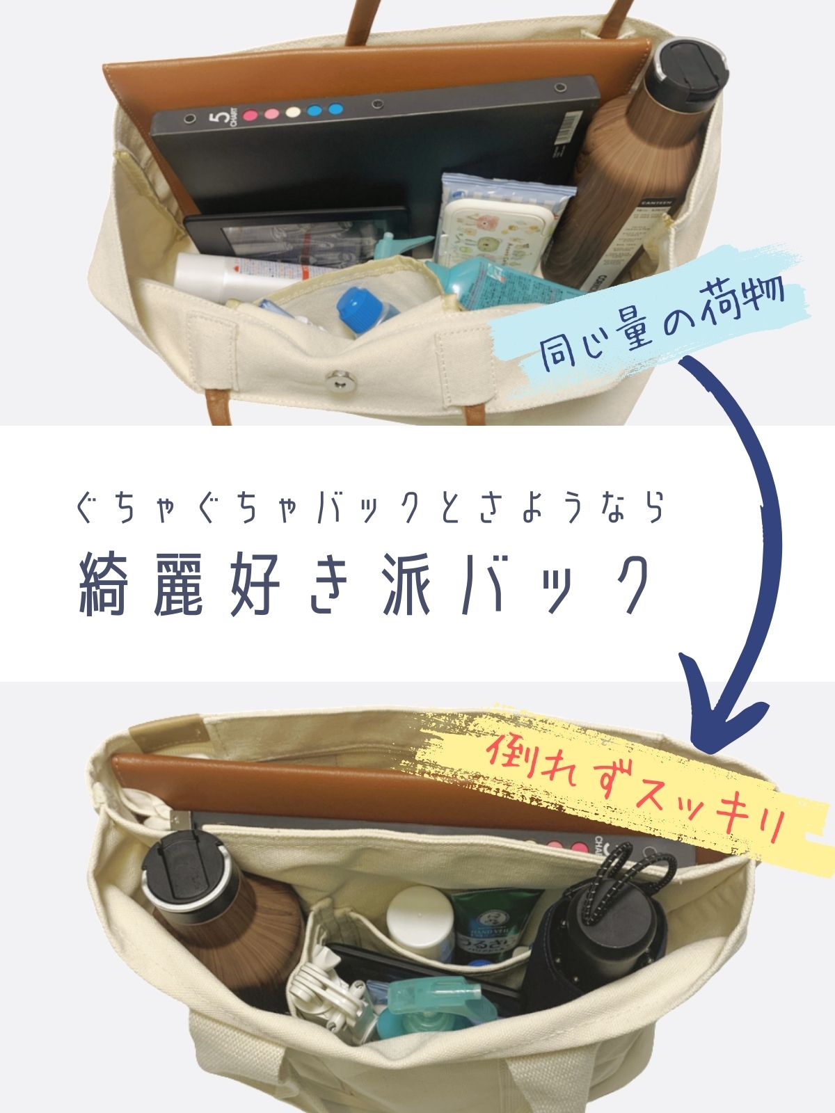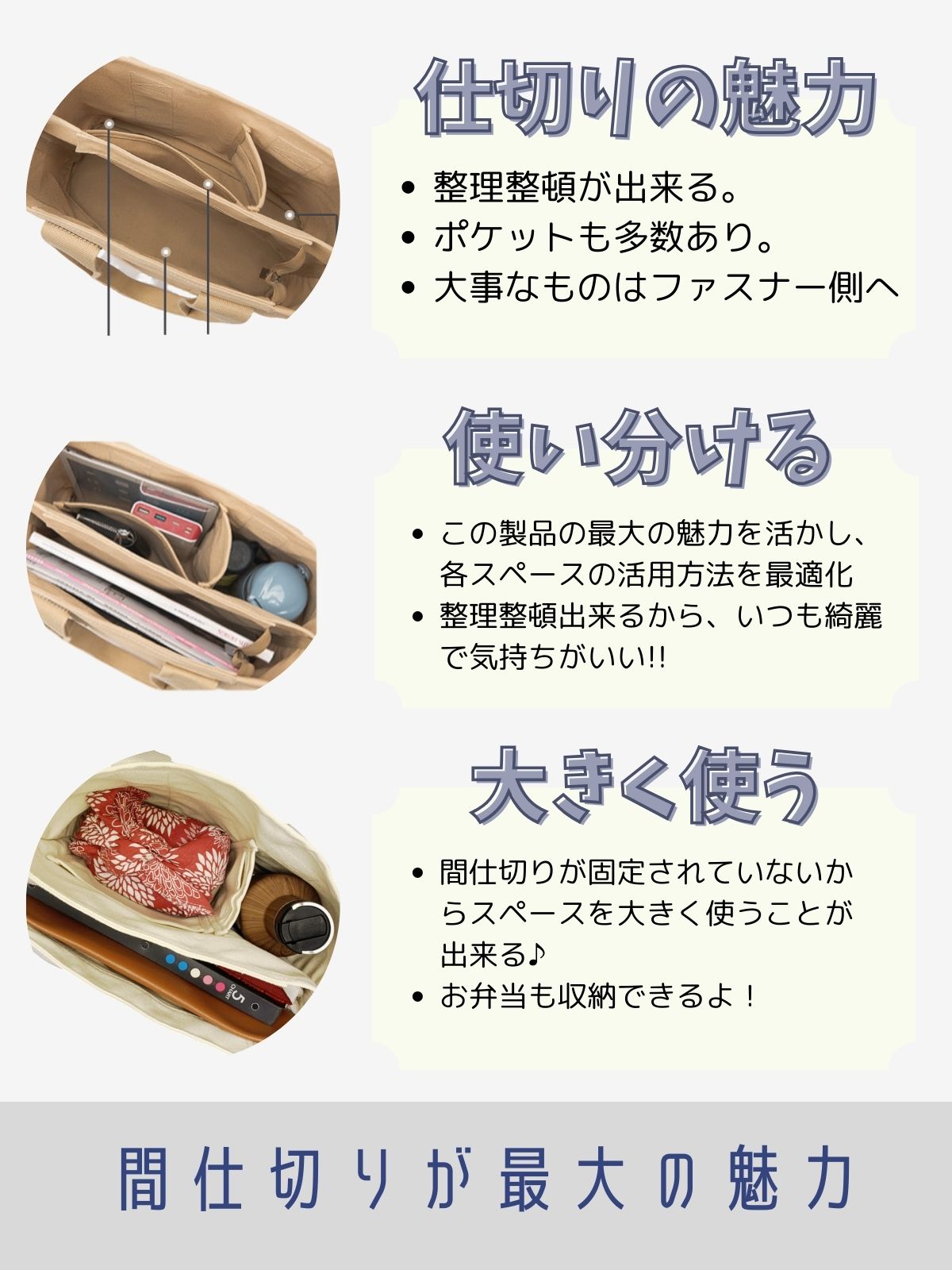 - 【製品の仕様について】間仕切りは可変するように、底部分は縫い付けられていません。間仕切りが可変することによって、スペースの活用の幅を広げます。例えば、間仕切り以上の厚みや幅のある荷物や太めの水筒を入れるなどです。固定されていないことによって、多くの荷物を目的のスペースに収納することが出来ます。